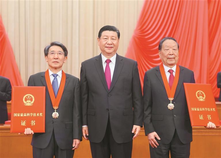 6月24日,全国科技大会、国家科学技术奖励大会和中国科学院第二十一次院士大会、中国工程院第十七次院士大会在北京人民大会堂隆重召开。中共中央总书记、国家主席、中央军委主席习近平向获得2023年度国家最高科学技术奖的武汉大学李德仁院士(右)和清华大学薛其坤院士(左)颁奖。新华社记者 鞠鹏 摄