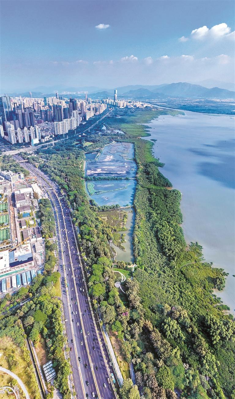 在深圳的城市中心区,一片生机盎然的湿地,红树林葱茏繁茂,黑脸琵鹭姿态优雅,黑翅长脚鹬嬉戏追逐,大弹涂鱼活蹦乱跳……宛若“世外桃源”,维系着城市与自然的平衡。