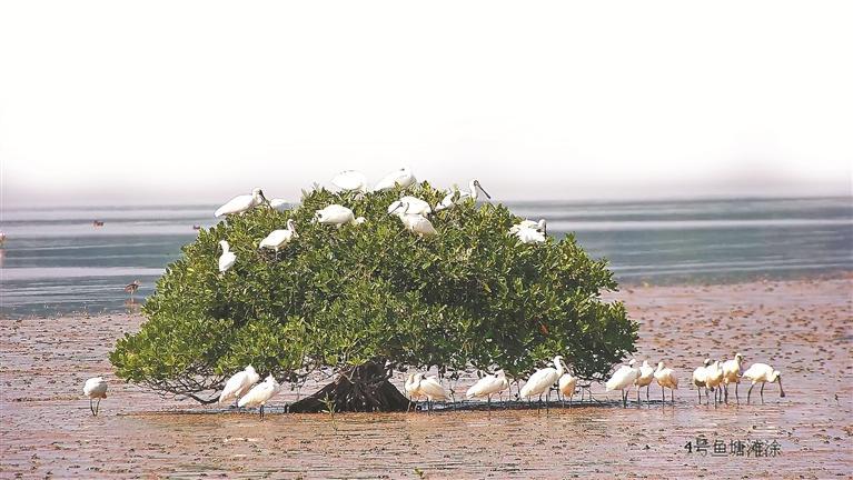 “瞧,海上红树开始‘长’黑脸琵鹭了。”在管理局工作人员引导下,记者循声看去,滩涂上一棵茂盛的红树停歇着十余只白羽黑脸长嘴的水鸟。