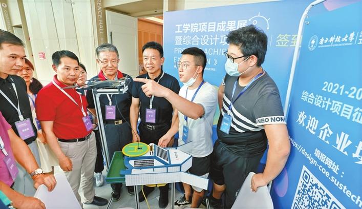 鼓励高校探索新的创业管理制度使学术创新与商业化应用充分结合。图为南科大学生与企业部分人士在项目展示现场交流。深圳特区报记者 刘钢 摄