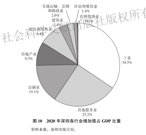 深圳三次产业结构由2019年的0.1∶38.5∶61.4调整为2020年的0.1∶37.8∶62.1(见图9)。分行业看,农林牧渔业占GDP比重为0.1%,与上年持平;建筑业、金融业、房地产业占GDP比重分别为3.4%、15.1%和9.3%,比上年分别提高0.1个、1.7个和0.6个百分点;工业,批发和零售业,交通运输、仓储和邮政业,住宿和餐饮业,其他服务业占GDP比重分别为34.5%、8.4%、2.6%、1.4%和25.2%,比上年分别下降0.8个、0.9个、0.3个、0.3个和0.1个百分点(见图10)。