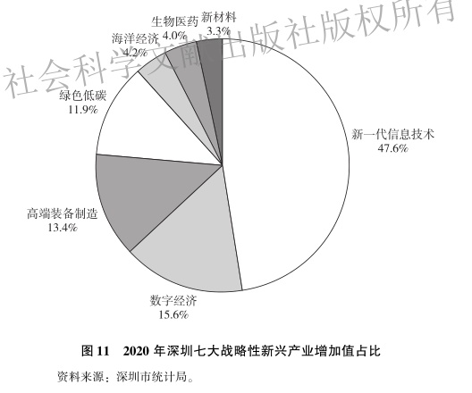 2020年,深圳战略性新兴产业增加值为10272.72亿元,按可比价计算,增长3.1%,与深圳GDP增速持平,占全市GDP比重达到37.1%。其中,新一代信息技术增加值为4893.45亿元,增长2.6%;数字经济为1601.03亿元,下降0.2%;高端装备制造为1380.69亿元,增长1.8%;绿色低碳为1227.04亿元,增长6.2%;海洋经济为427.76亿元,增长2.4%;新材料为334.5亿元,下降0.2%;生物医药为408.25亿元,增长24.4%。七大战略性新兴产业增加值占比见图11。