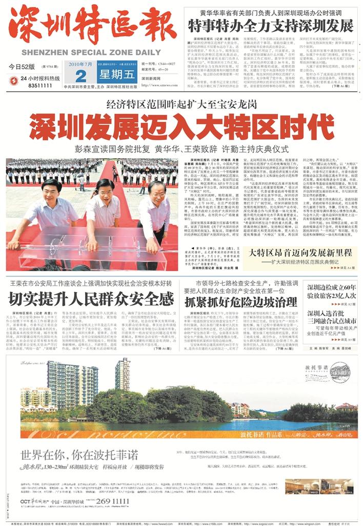 2010年7月2日,《深圳发展迈入大特区时代》发表在《深圳特区报》头版。