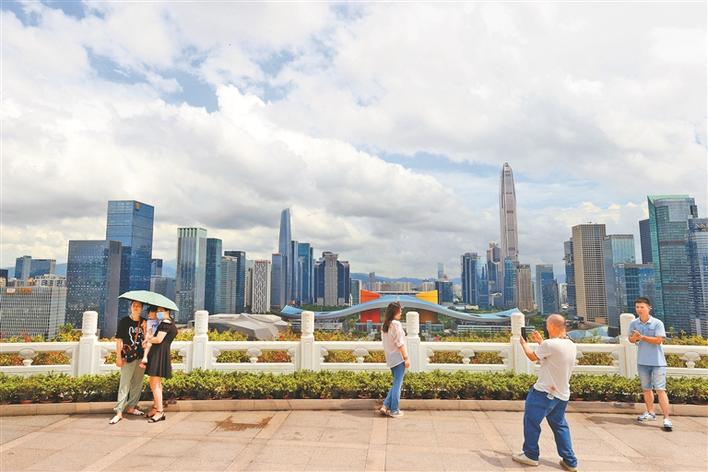 市民在莲花山顶小平铜像广场,远眺深圳城市风光。深圳特区报首席记者 杨少昆 摄
