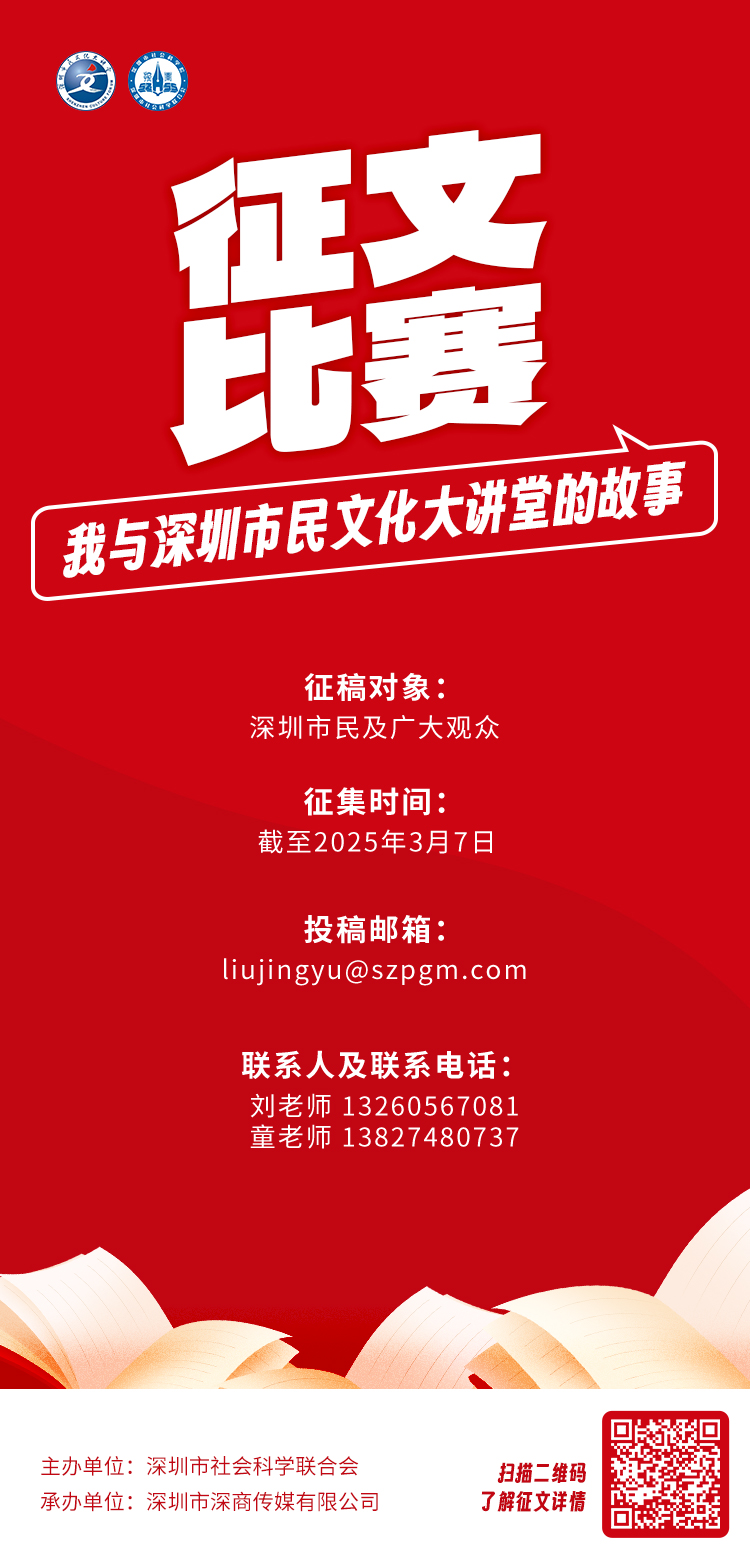 在深圳市民文化大讲堂举办20周年之际,由深圳市社会科学联合会主办、深圳市深商传媒有限公司承办的“我与深圳市民文化大讲堂的故事”征文比赛即日起正式启动。